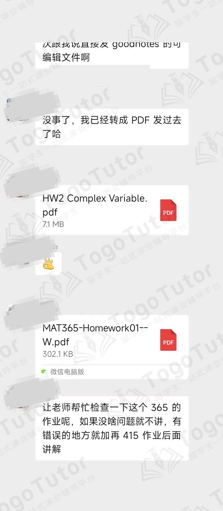 真正让我感受到途鸽细致服务的,是后续的作业协助。第一次完成 MAT365 的作业时,我心里完全没底,生怕理解偏了白费功夫。我把作业文件发到途鸽的学术群,没想到老师很快回复:“可以帮你看一下,没问题就不讲,有错误或难点就合并到下次 MAT415 的辅导里一起讲解。”这种“精准纠错+延伸辅导”的模式,既节约时间,又真的帮我理清了思路。辅导老师甚至会用微信电脑版分屏,一步步带我推导复杂公式,直到我彻底搞懂。